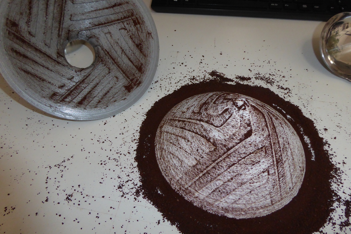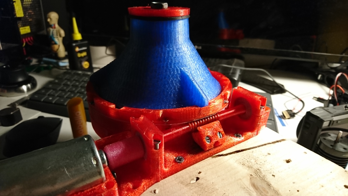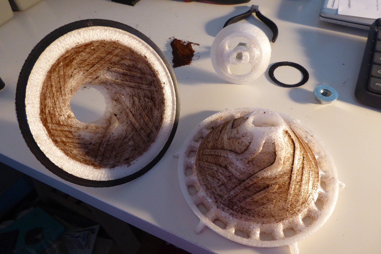 | The first iteration of the grinder was just two cones that I actuated by hand to grind beans. It was surprisingly effective given that it was entirely made of plastic. |