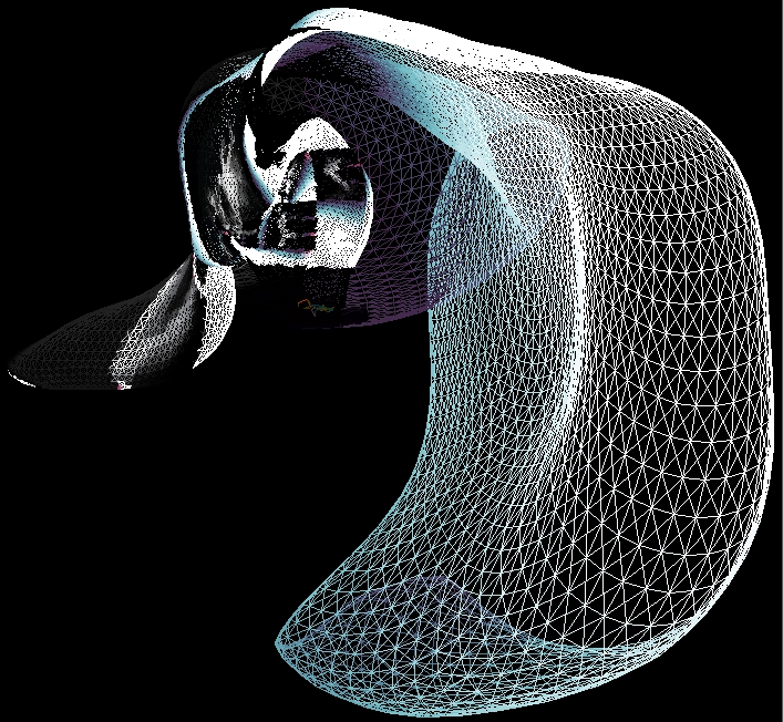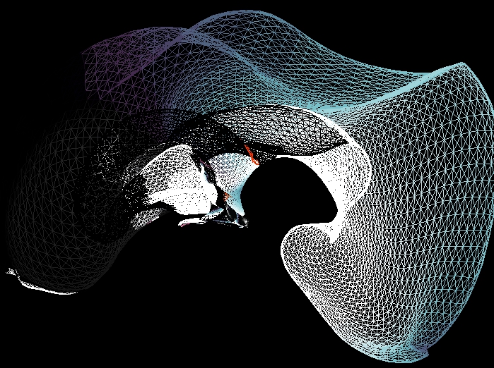 | And here are the results - two videos show how the mask overlay plays nicely with the "strings" mesh. The idea was to make it look "plasma-y". I tried implementing some blurring filters in the applet but ultimately it looked better when filmed off of my old giant plasma TV in the dark. | |