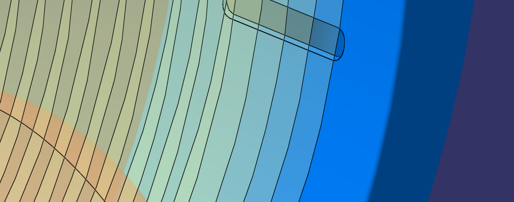 Note that I've chosen to sweep the outlet, an angle I'm calling "sway", in order to ensure that the blades never fully choke the outlet ports on the manifold. If that were to happen you would get some really odd water hammer effects that could cause fatigue. I've never seen a rotor like this, and am curious how this "sway" parameter would affect performance. An integrated potted electric motor drives the rotor. It contains a built-in control circuit that regulates turbine speed as a function of the coolant and air temperatures. |